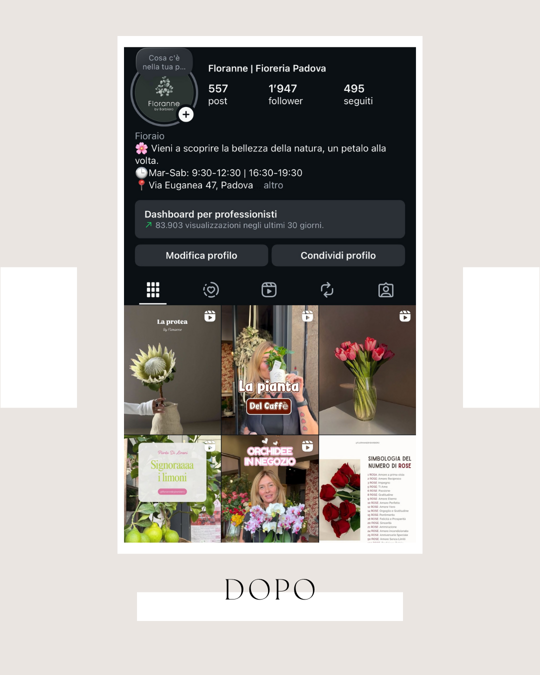 Dopo il nostro intervento, il profilo ha acquisito una nuova identità: la bio è stata riscritta in modo emozionale, il feed è diventato armonico e riconoscibile, e i reel sono diventati il cuore pulsante della comunicazione. Ogni contenuto è pensato per creare relazione, coinvolgere e valorizzare i fiori come esperienze, non solo prodotti.